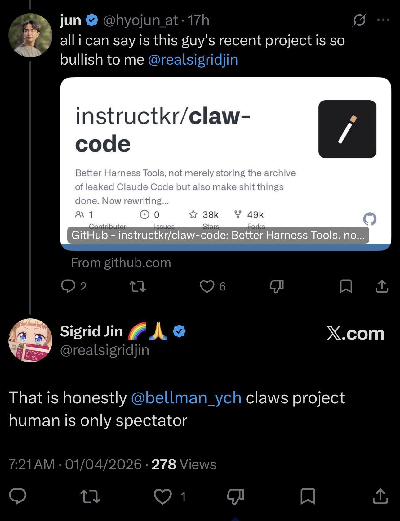 Sigrid Jin (@realsigridjin) wakes to her phone blowing up. Rather than host the raw leak, she sits down and does a clean-room Python rewrite using oh-my-codex (OmX) โ an orchestration layer on OpenAI Codex โ with parallel review loops.